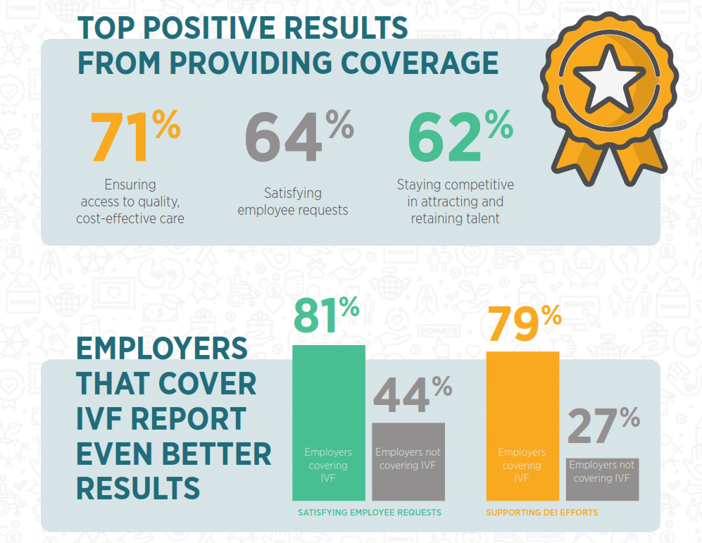 A 2017 survey conducted by FertilityIQ of patients who had undergone IVF found that employees who had their IVF covered reported being more likely to remain in their job for a longer period (62%), were more willing to overlook shortcomings of their employer (53%) and were more likely to work harder (22%).